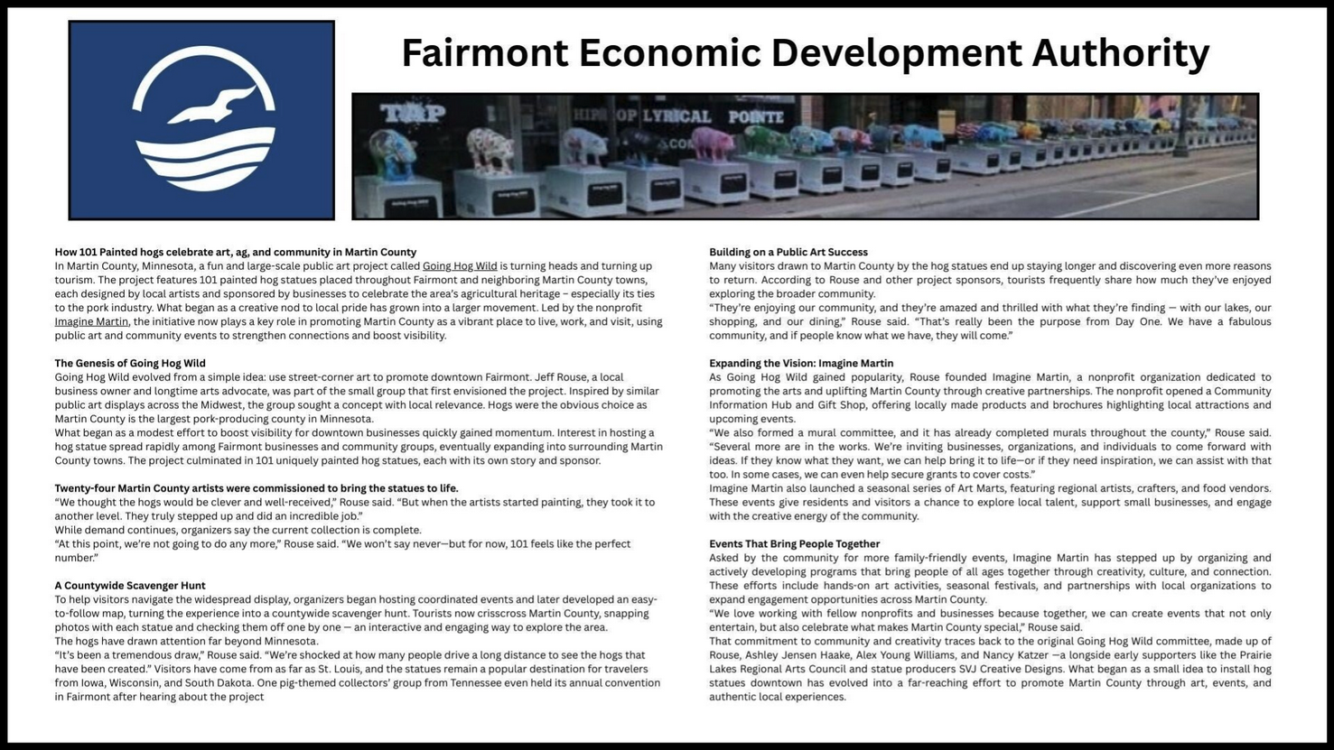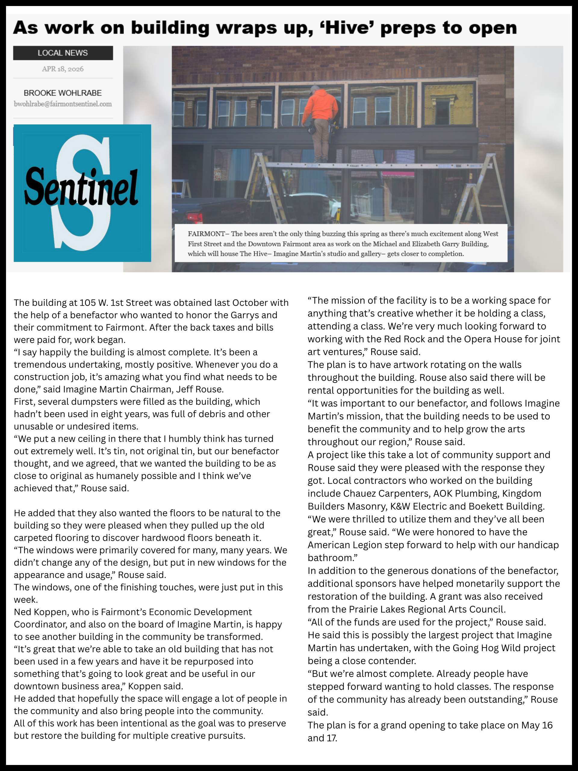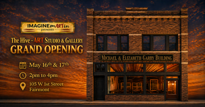 Imagine Martin’s mission is to serve as a beacon for artistic experiences across southern Minnesota and northern Iowa, inviting visitors to explore, discover, and engage with the visual and performing arts. We support and promote local and regional artists, helping bring their creativity to life for the community and visitors alike while strengthening the cultural and economic vitality of the region.