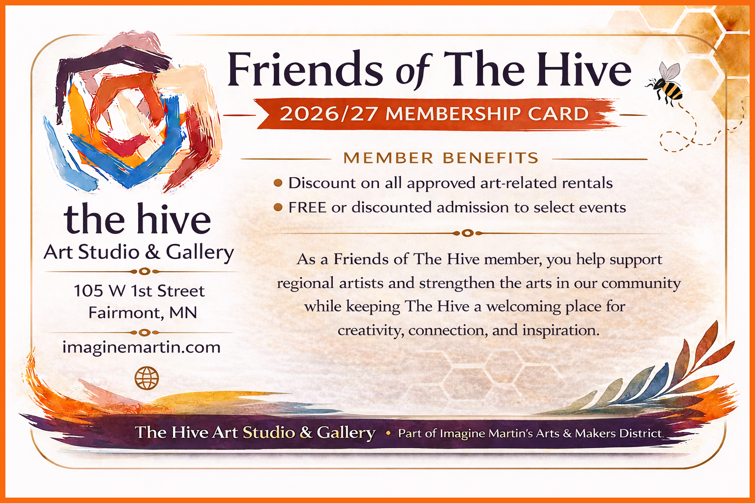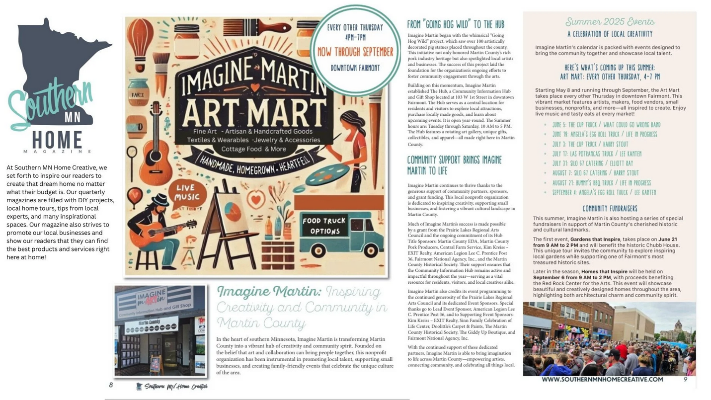 Imagine Martin’s mission is to serve as a beacon for artistic endeavors and events across southern Minnesota and northern Iowa, supporting individuals, groups, and nonprofits in creating and promoting the visual and performing arts.