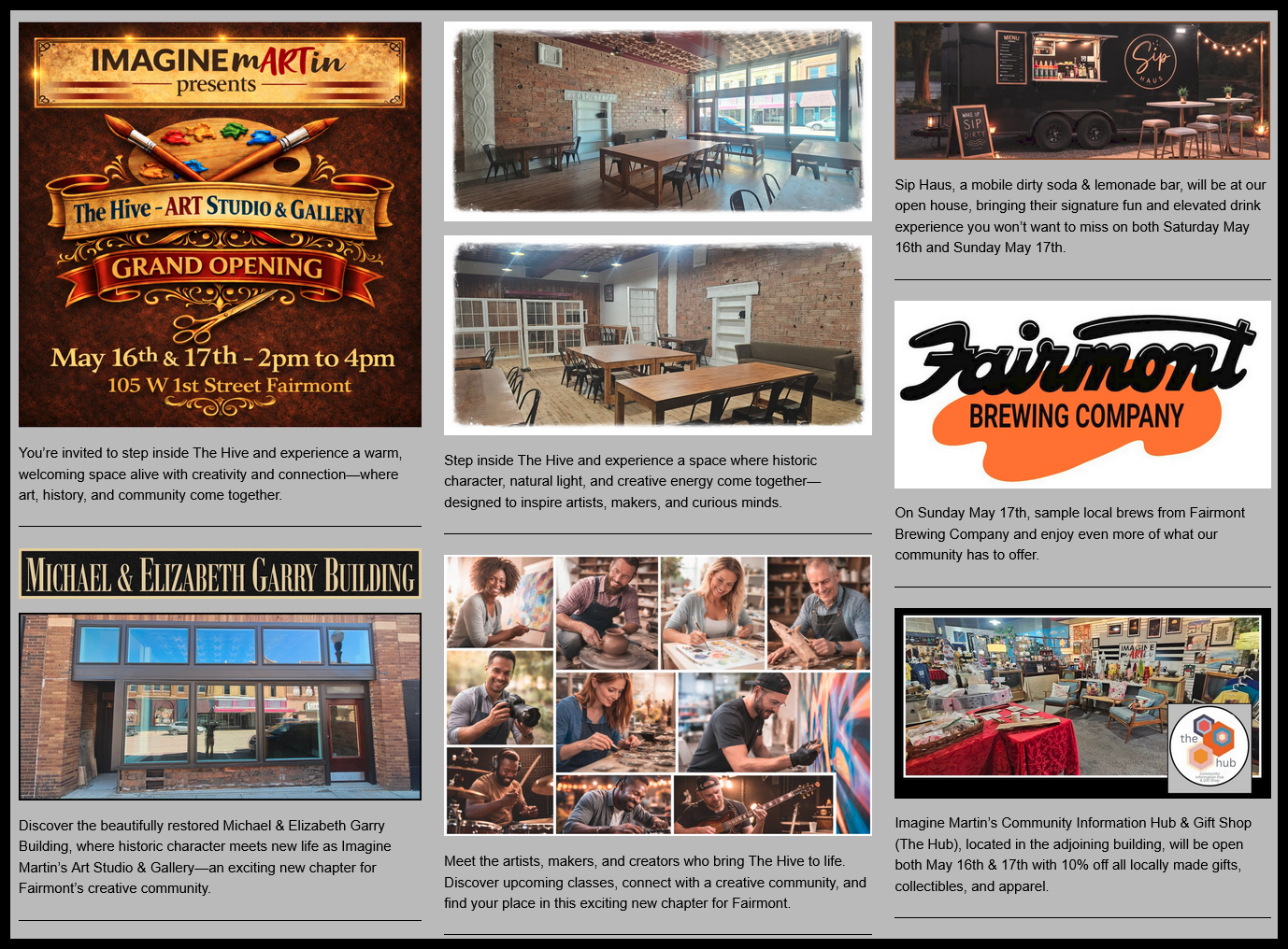 In collaboration with other venues and fellow nonprofits, these efforts help position Fairmont and Martin County as a destination where creativity is discovered, experienced, and celebrated.