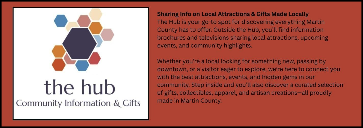 The Hub serves as a gateway to Fairmont and Martin County, highlighting local artists, makers, and businesses while providing information on events, attractions, and opportunities to get involved. Just steps away, The Hive offers an inspiring space for creation and collaboration, featuring art studios, gallery space, classes, workshops, meetings, and flexible rental options for artists, educators, nonprofits, and community groups.