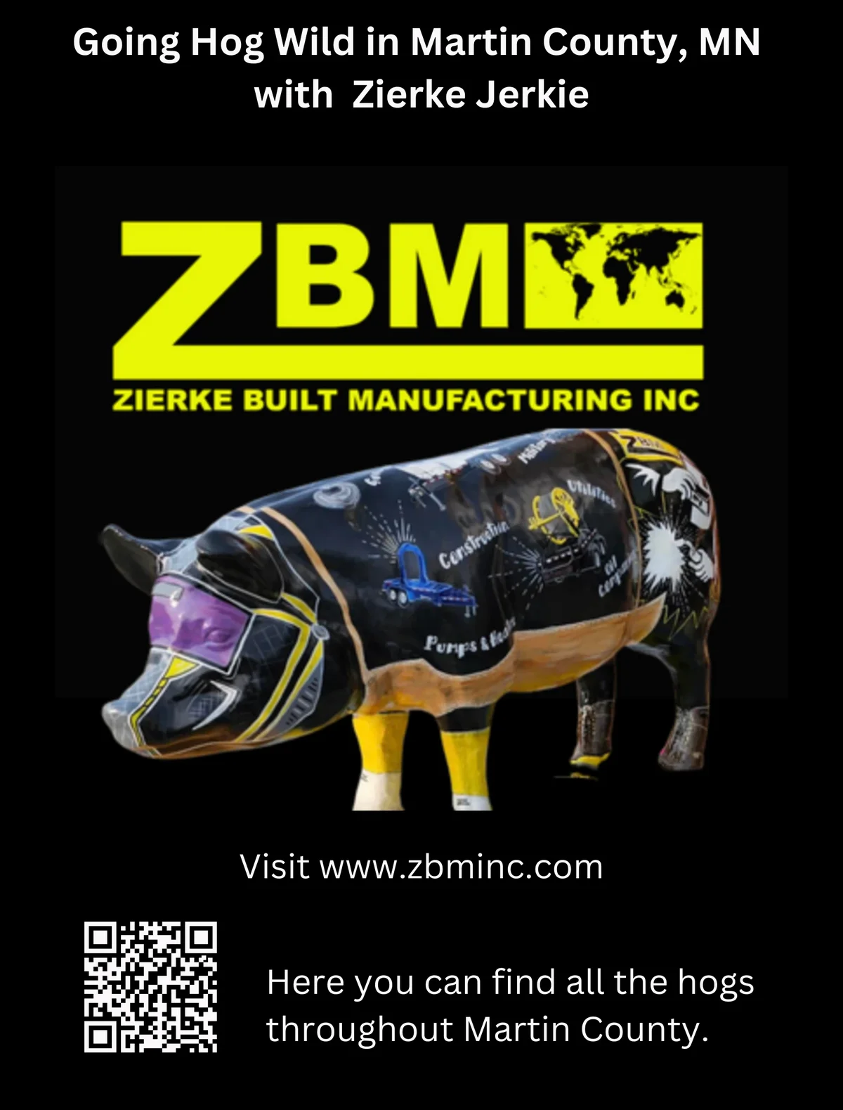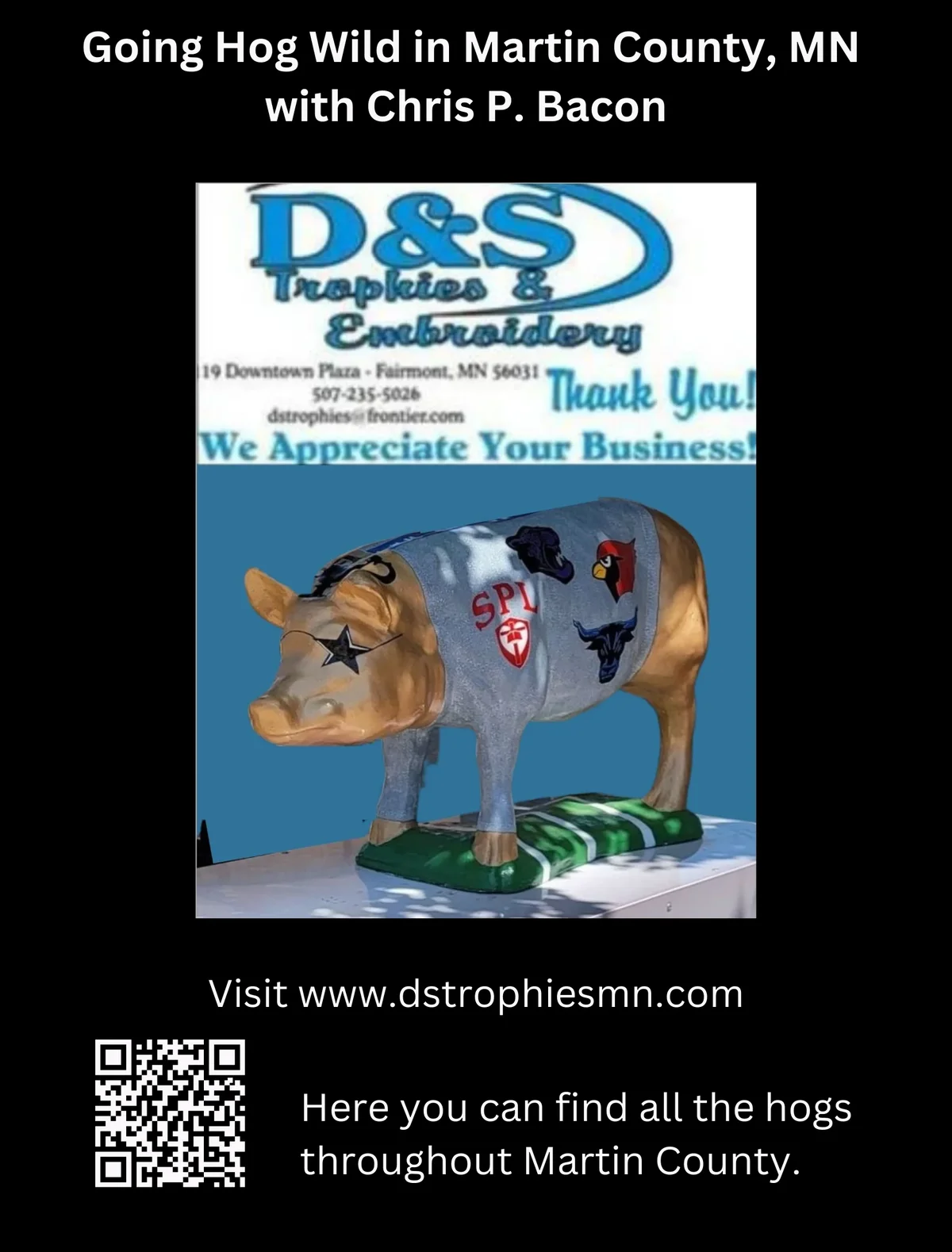 Made possible through generous support from the Prairie Lakes Regional Arts Council, the Martin County Area Foundation, and the Schmeeckle Foundation, the project serves several purposes: to promote local businesses, celebrate local art, honor the pork industry, and attract tourism. Each hog represents a participating business or organization, enriching the cultural landscape and creating a vibrant, countywide art experience.