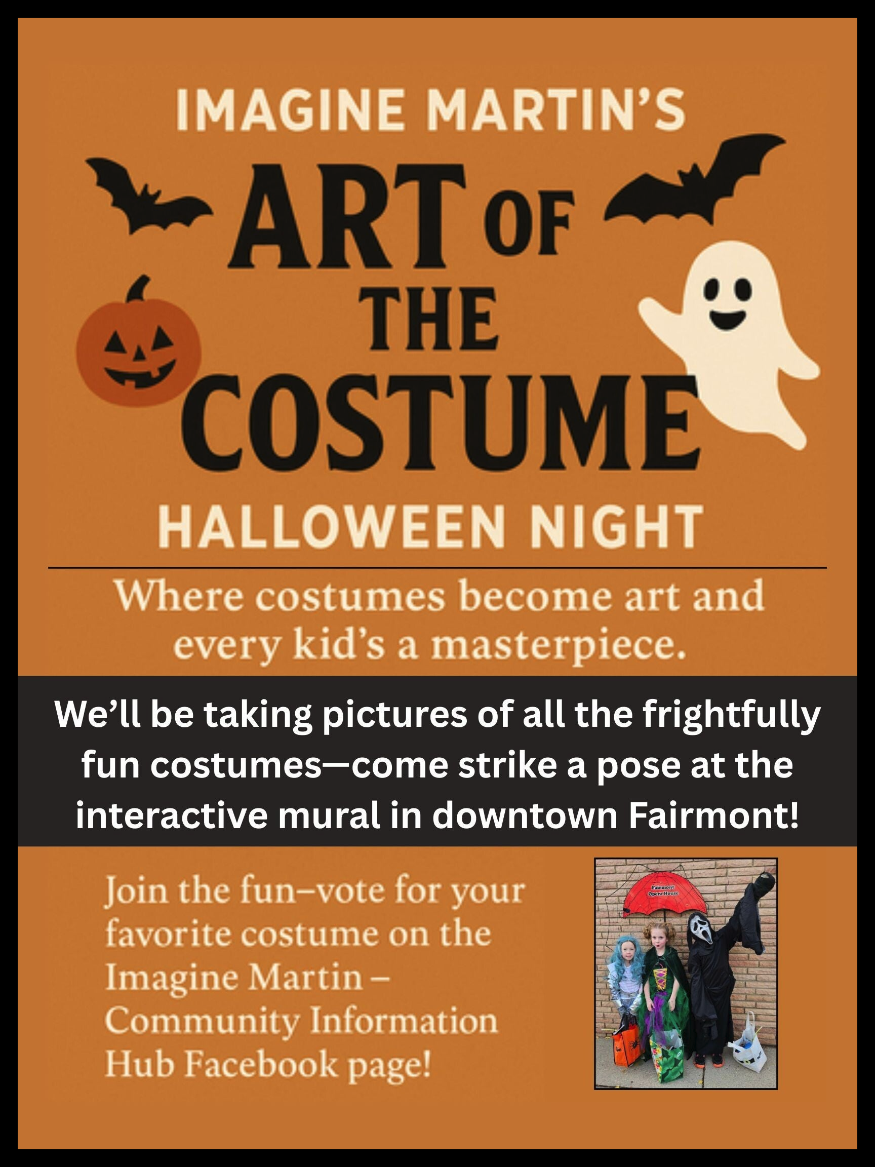 On Halloween night in both 2023 and 2024, Imagine Martin hosted a photo shoot for the downtown trick or treaters at its Interactive Mural in downtown Fairmont.